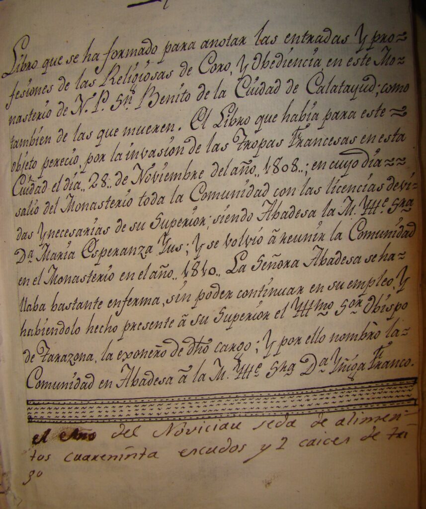 En el fondo del monasterio de San Benito de Calatayud se echa en falta el libro primero, que recogía la fundación de este monasterio. Cuenta con otros libros con las elecciones de abadesas desde 1515, las donaciones, rentas, cabreos de censales, tomas de hábitos y profesiones, con otros libros de contabilidad.