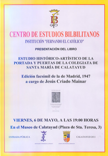 El próximo viernes, 6 de mayo, a las 19 horas, en el Museo de Calatayud, presentación del libro «Estudio Histórico-Artistico de la portada y puertas de la Colegiata de Santa María de Calatayud». Se trata de una edición fascímil de la obra publicada en 1947.
