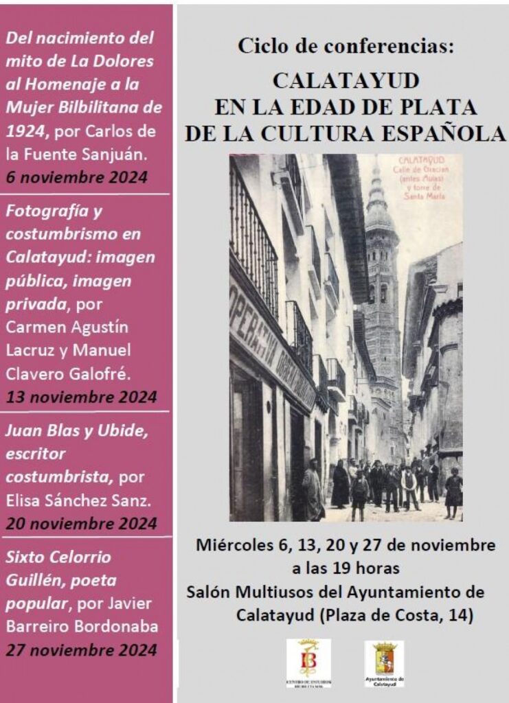 Mañana miércoles, 20 de noviembre, tendrá lugar la tercera conferencia del interesante ciclo organizado por el CEB: Calatayud en la Edad de Plata de la cultura española titulada “Juan Blas y Ubide, escritor costumbrista” e impartida por Elisa Sánchez Sanz, de la Universidad de Zaragoza y ponente de Etnografía en los últimos Encuentros de Estudios Bilbilitanos.