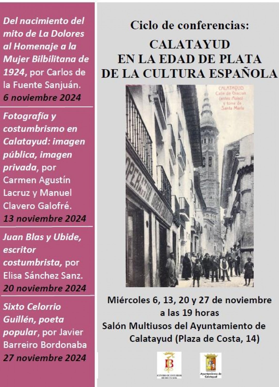 El Centro de Estudios Bilbilitanos ha organizado para el día 13 de noviembre, a las 19:00h, en el Salón Multiusos del Ayuntamiento de Calatayud (Plaza de Costa, 14), la conferencia: La fotografía y el costumbrismo en Calatayud, impartida por Carmen Agustín Lacruz.